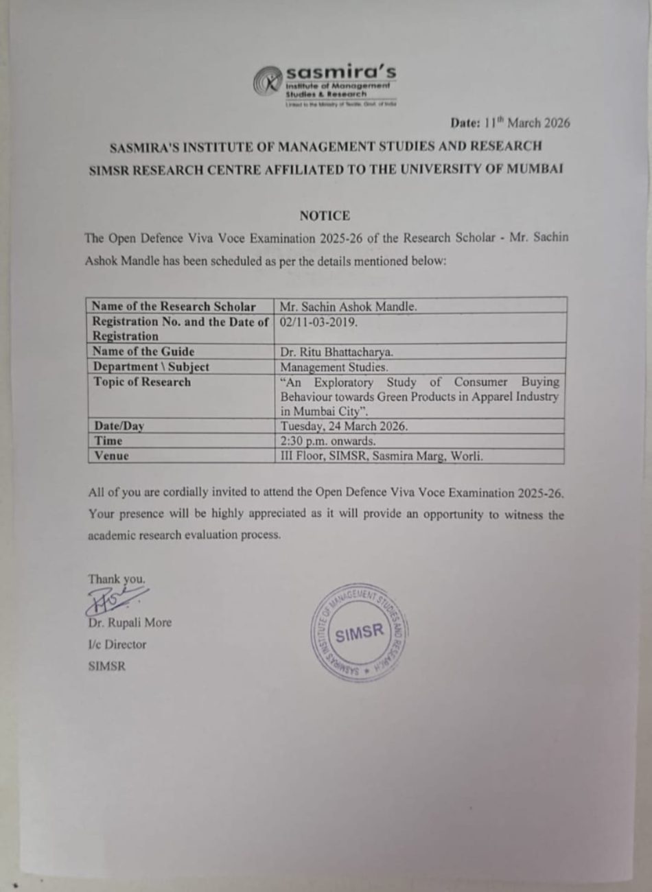 Sasmira’s Institute of Management Studies and Research is located in Worli, Mumbai. Accredited by the National Board of Accreditation (NBA), SIMSR belongs to the family of the 75 years old SASMIRA. The Institute program is approved by AICTE and affiliated to the University of Mumbai. Our institute offers courses that strongly emphasize on the challenges faced by business not only in India but also globally.